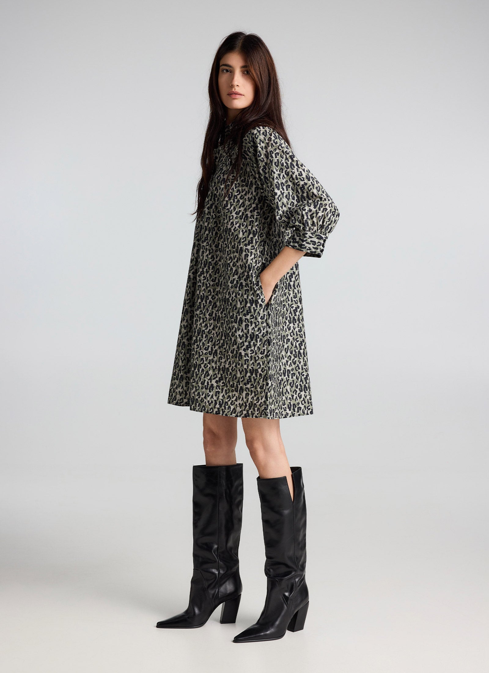 Bedrucktes Kleid mit V-förmigem Einsatz aus Baumwoll-Seidenmaterial