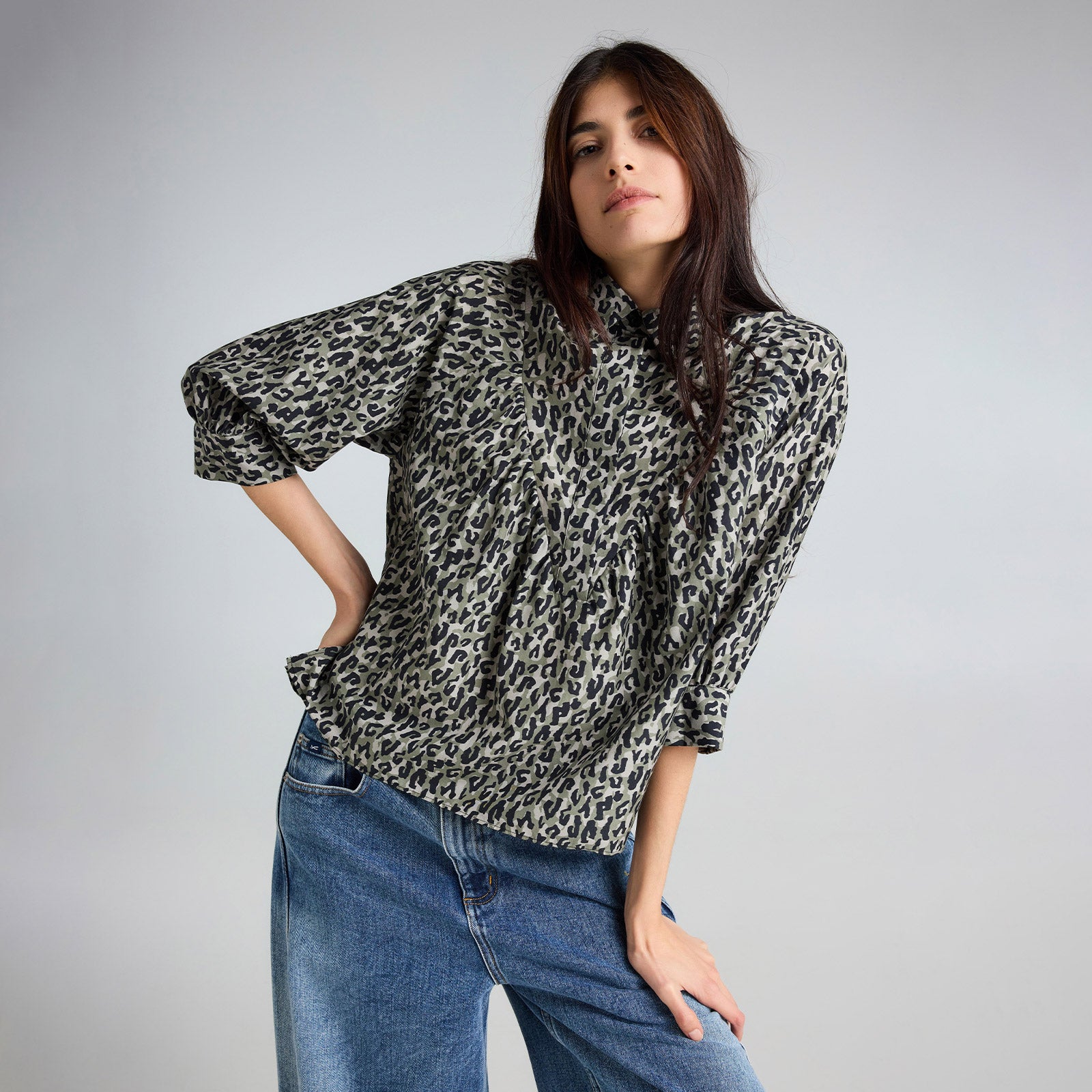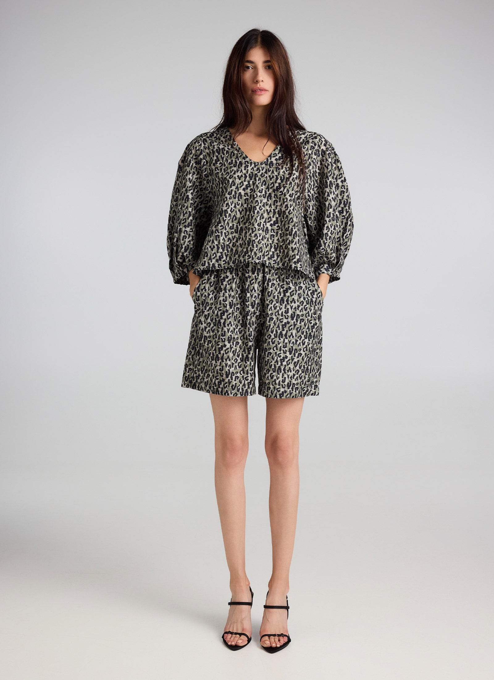 Bedruckte Bluse mit V-förmigem Einsatz aus Baumwoll-Seidenmateria