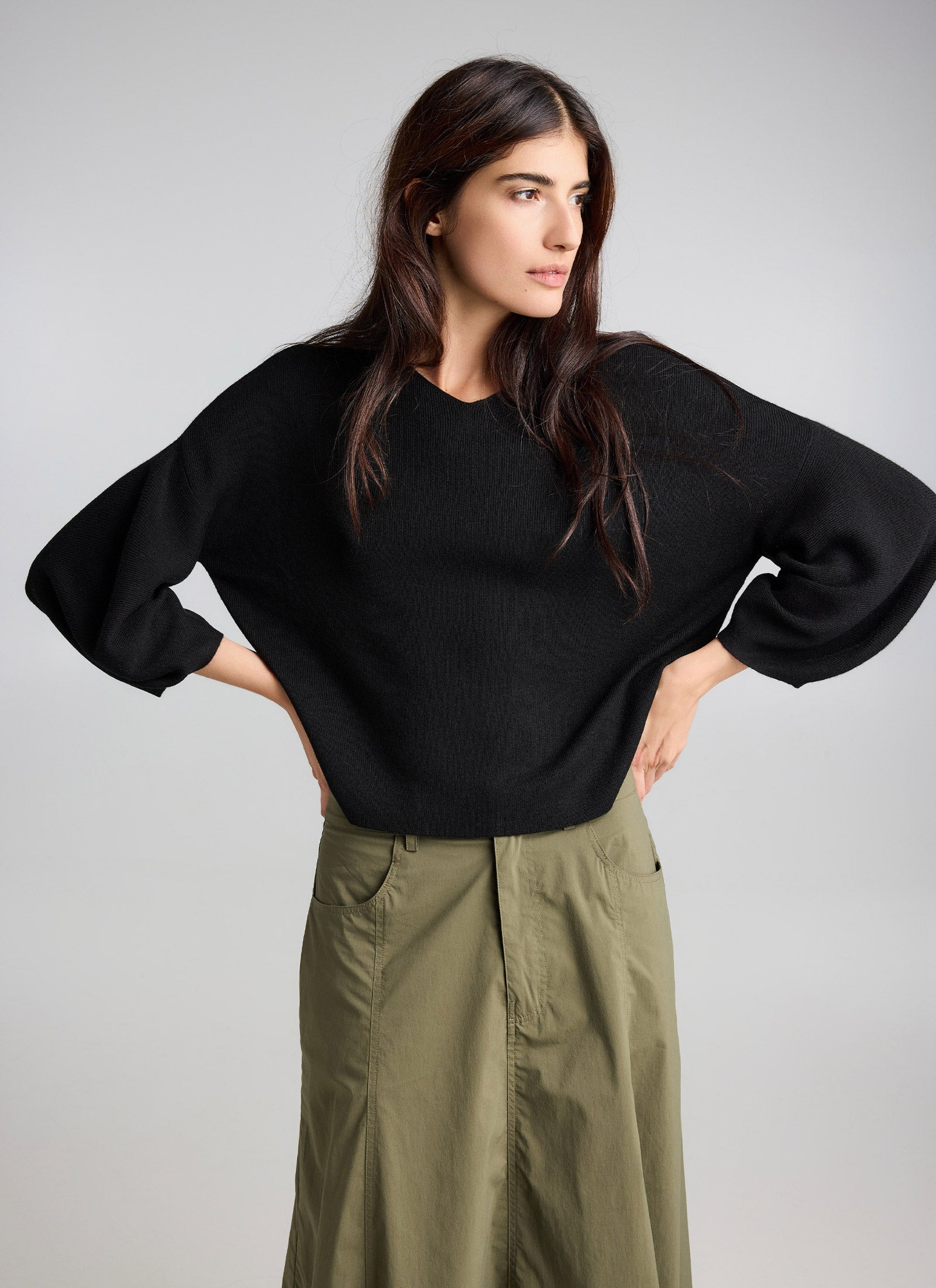 Verkürzter Pullover mit V-Ausschnitt und voluminösen Ärmeln aus einem Woll-Viskose Garn