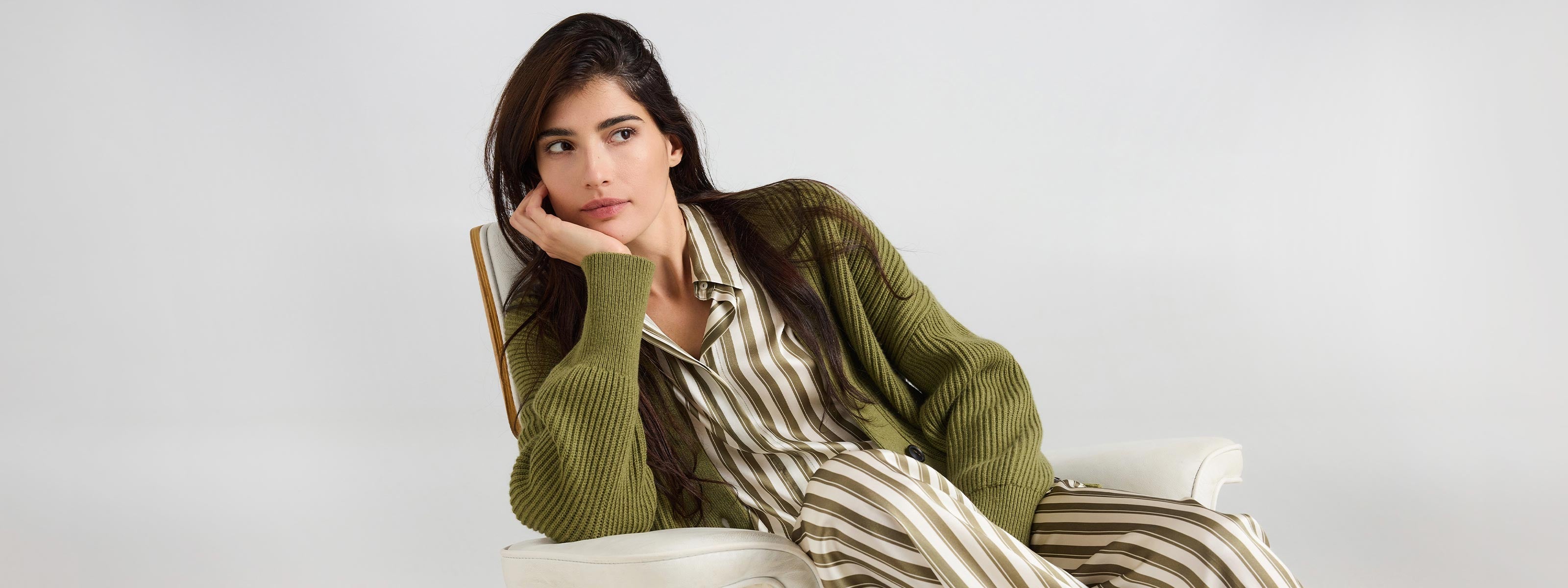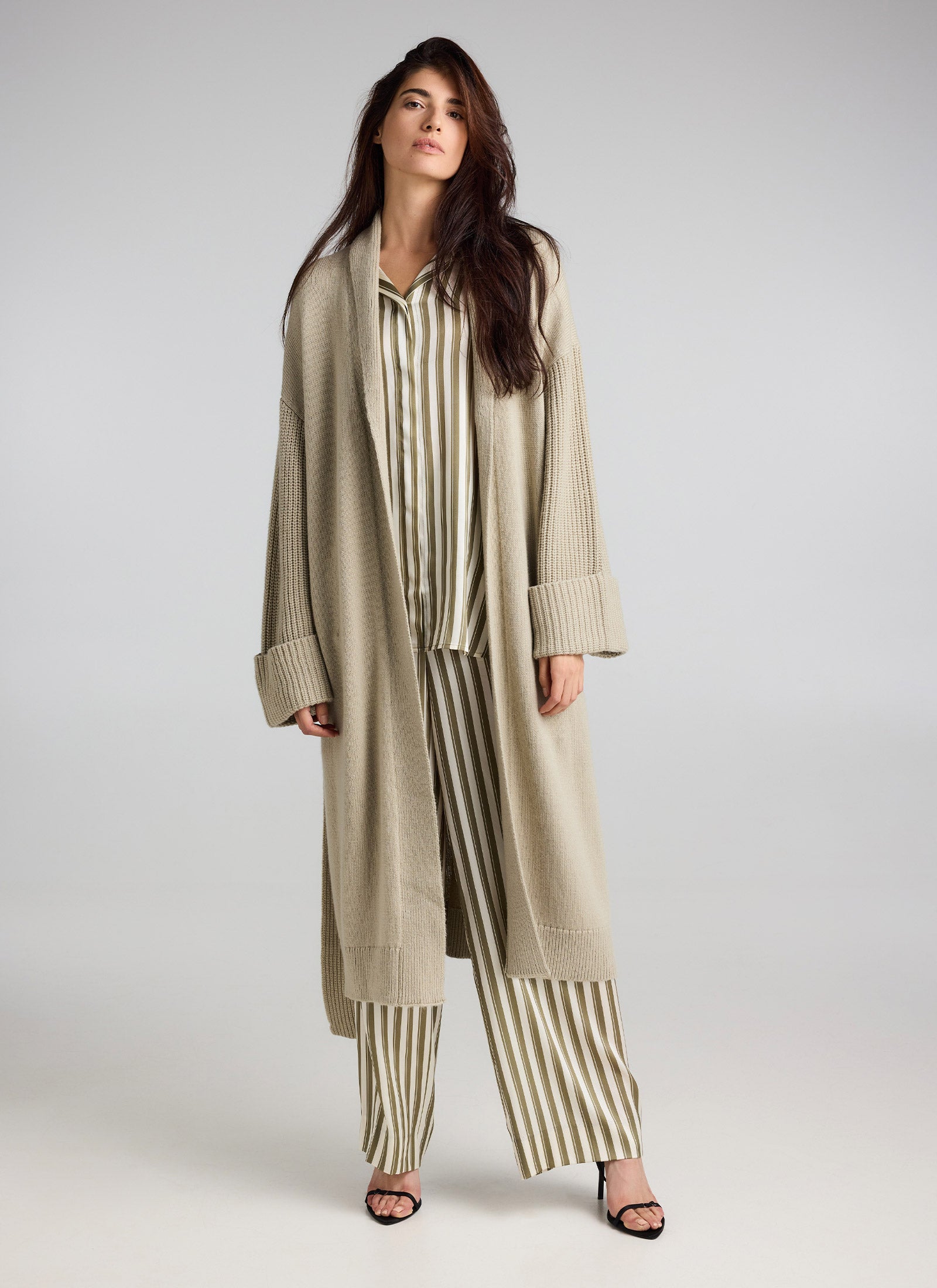 Lange Strickjacke aus Wollgarn mit Ripp-Ärmeln und Aufschlag