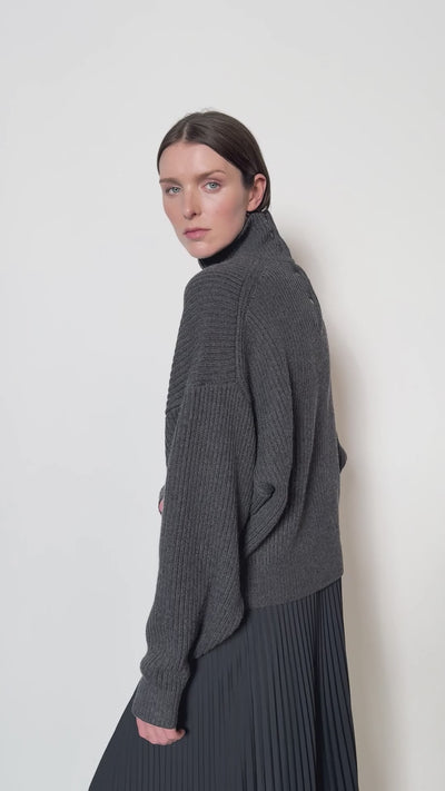Die überschnittene Schulter und der voluminöse Oberarm sorgen für einen neuen Look. Die am rückwärtigen Kragen eingestrickte Knopfleiste mit sichtbaren Knöpfen ist ein besonderes Detail, das dem Pullover seinen einzigartigen Charakter verleiht.