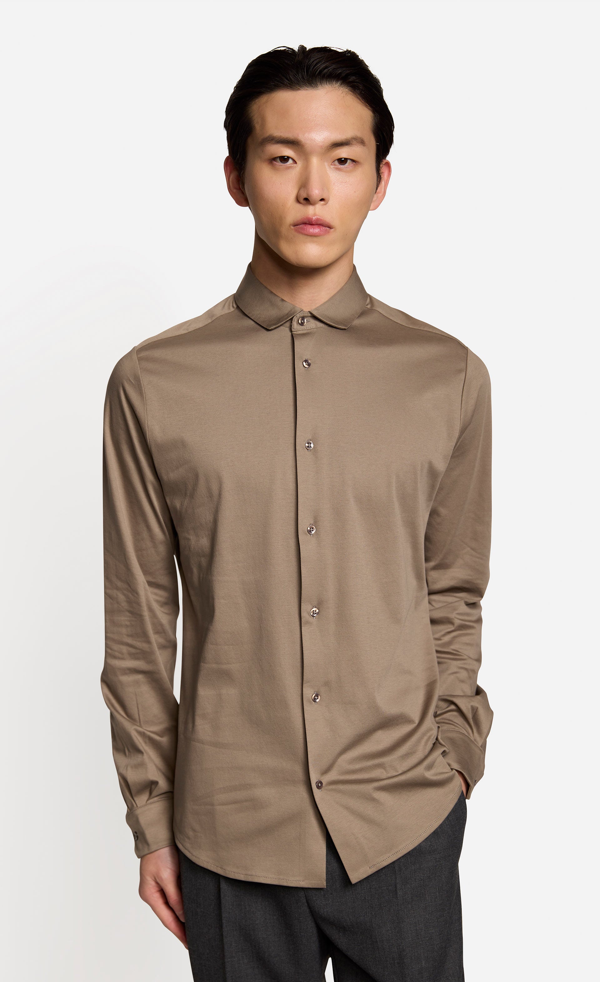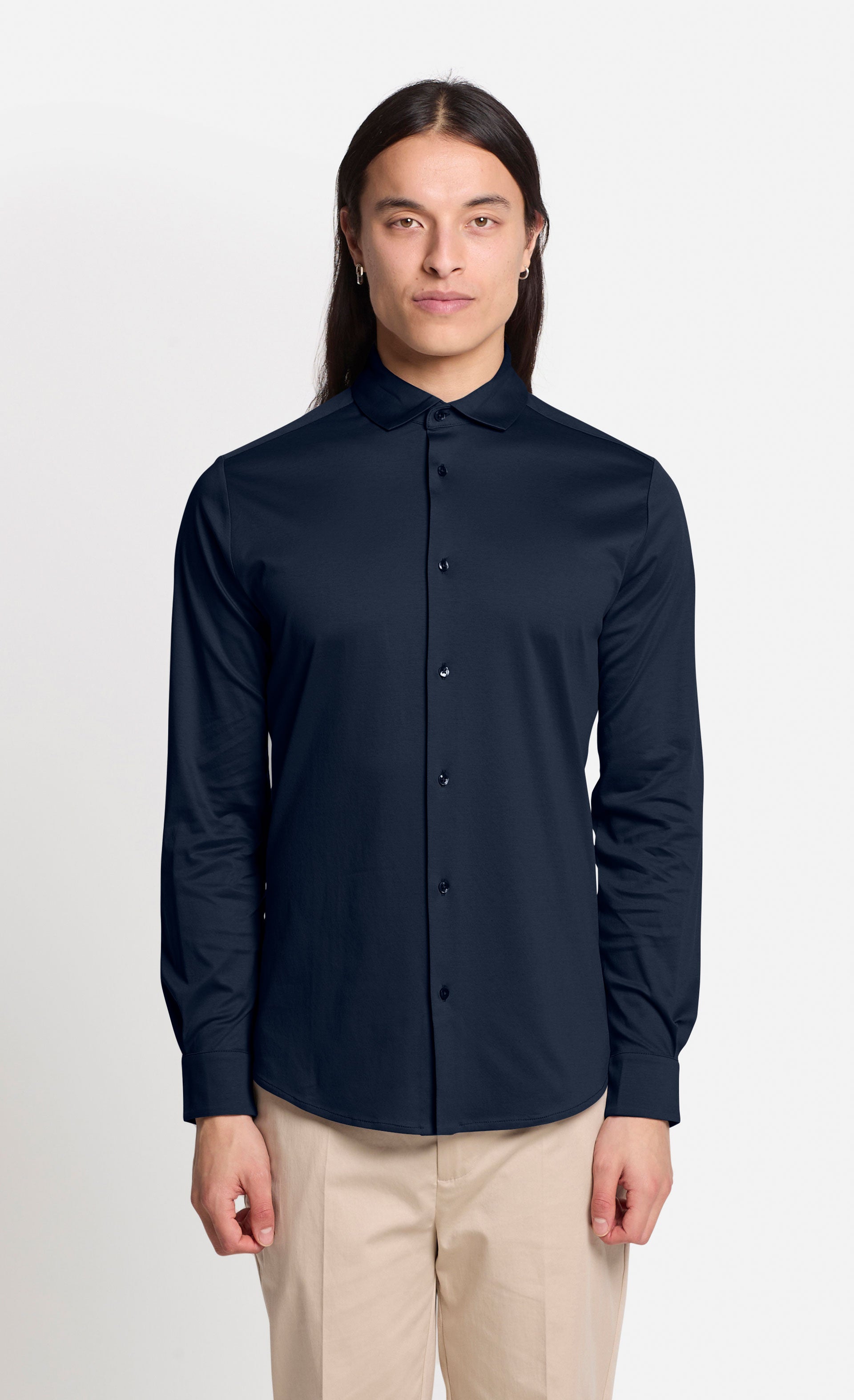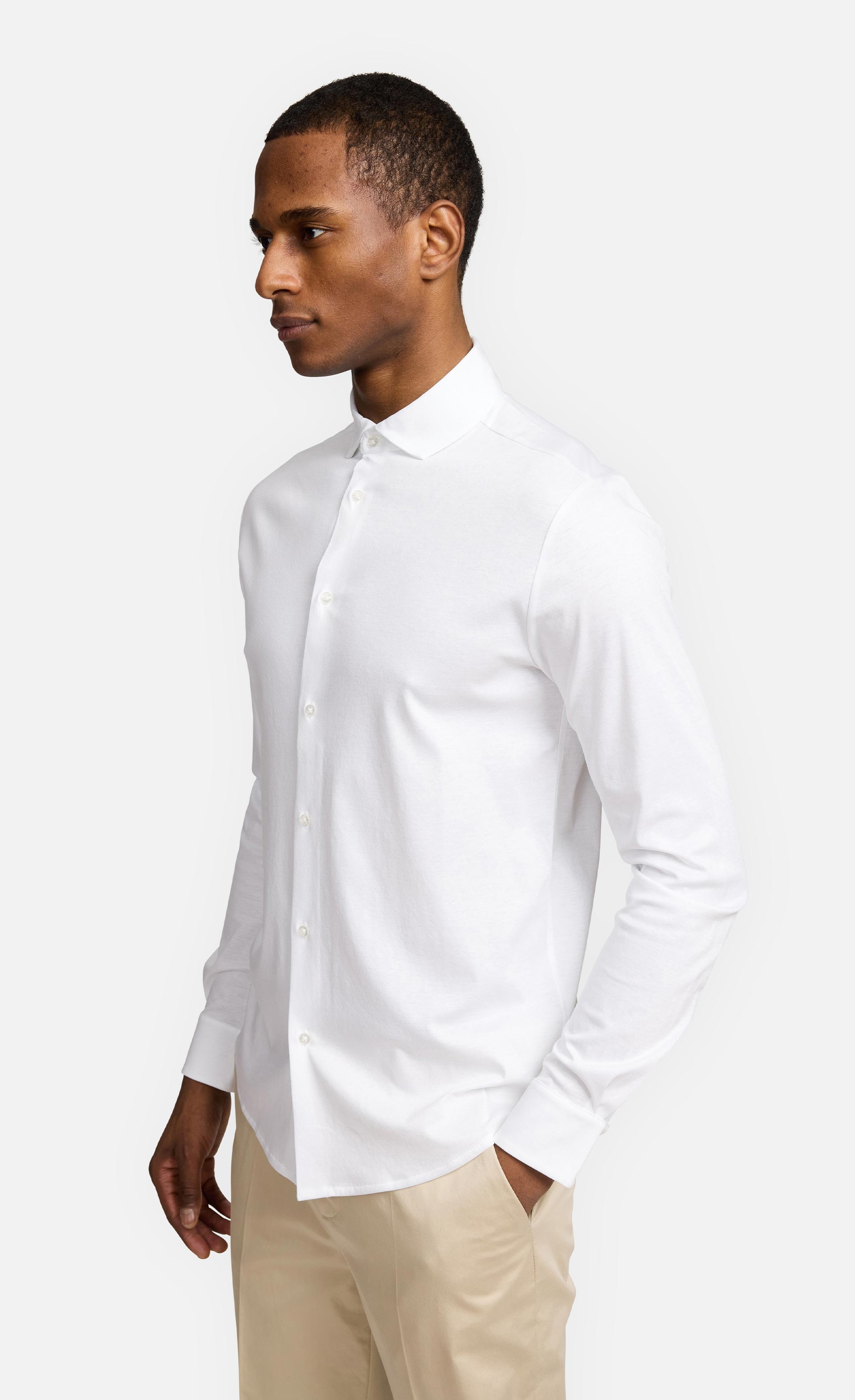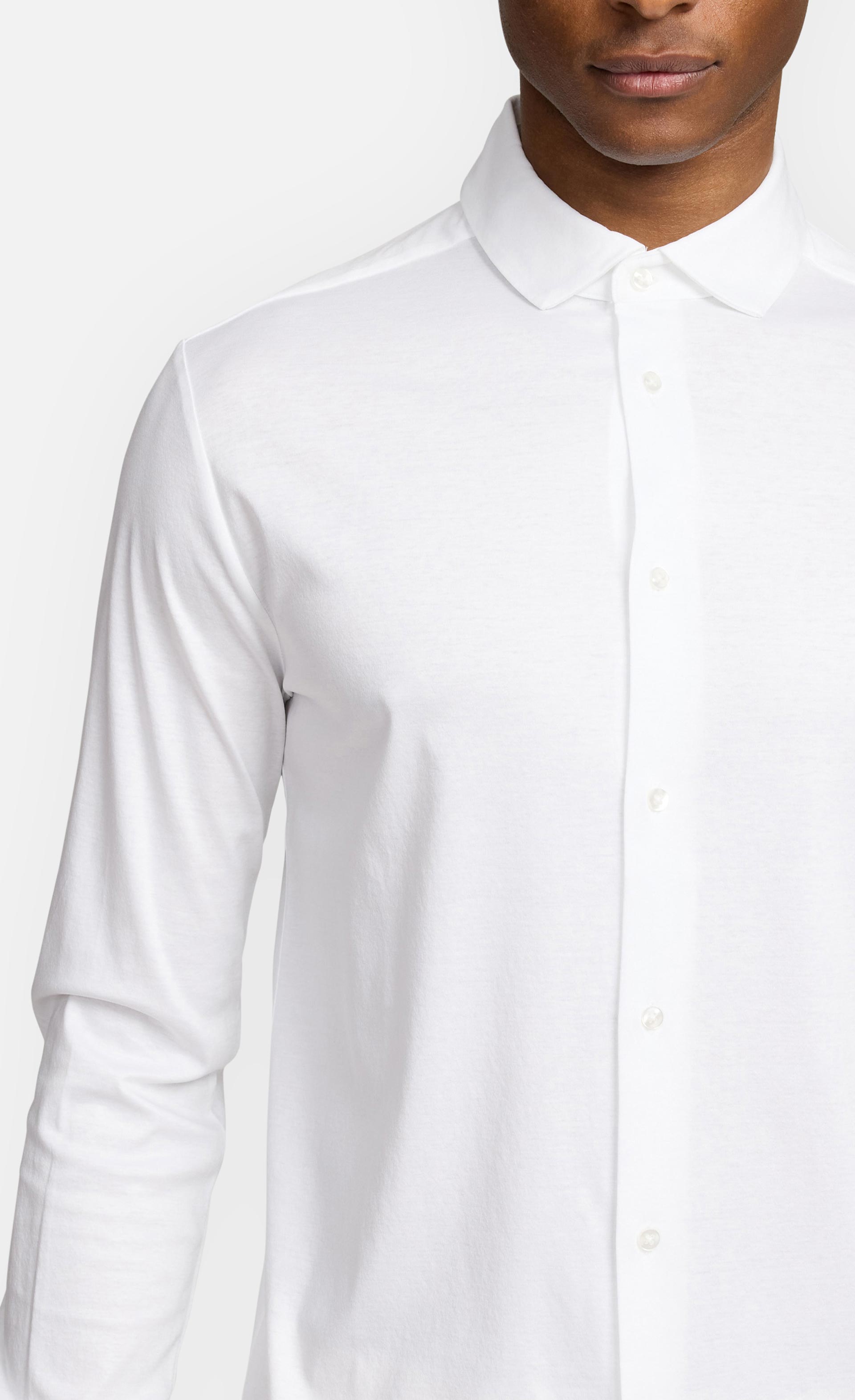 Dieses Hemd aus glatter, merzerisierter Baumwolle mit dezentem Glanz überzeugt durch den anschmiegsamen Jersey. Das Hemd kreiert durch den klassischen Haifischkragen, die sichtbare Knopfleiste und die knöpfbaren Manschetten einen eleganten und dennoch legeren Look.