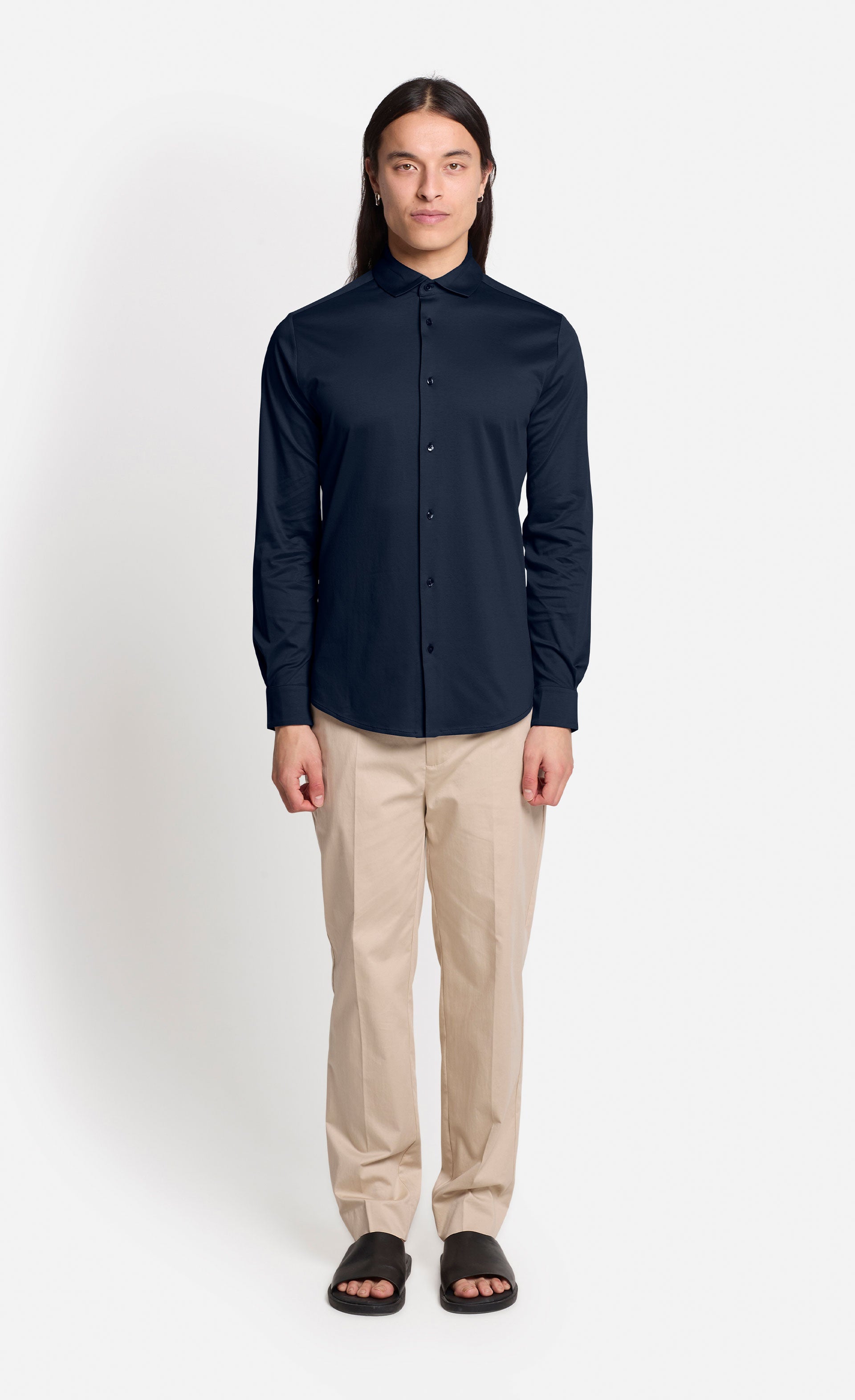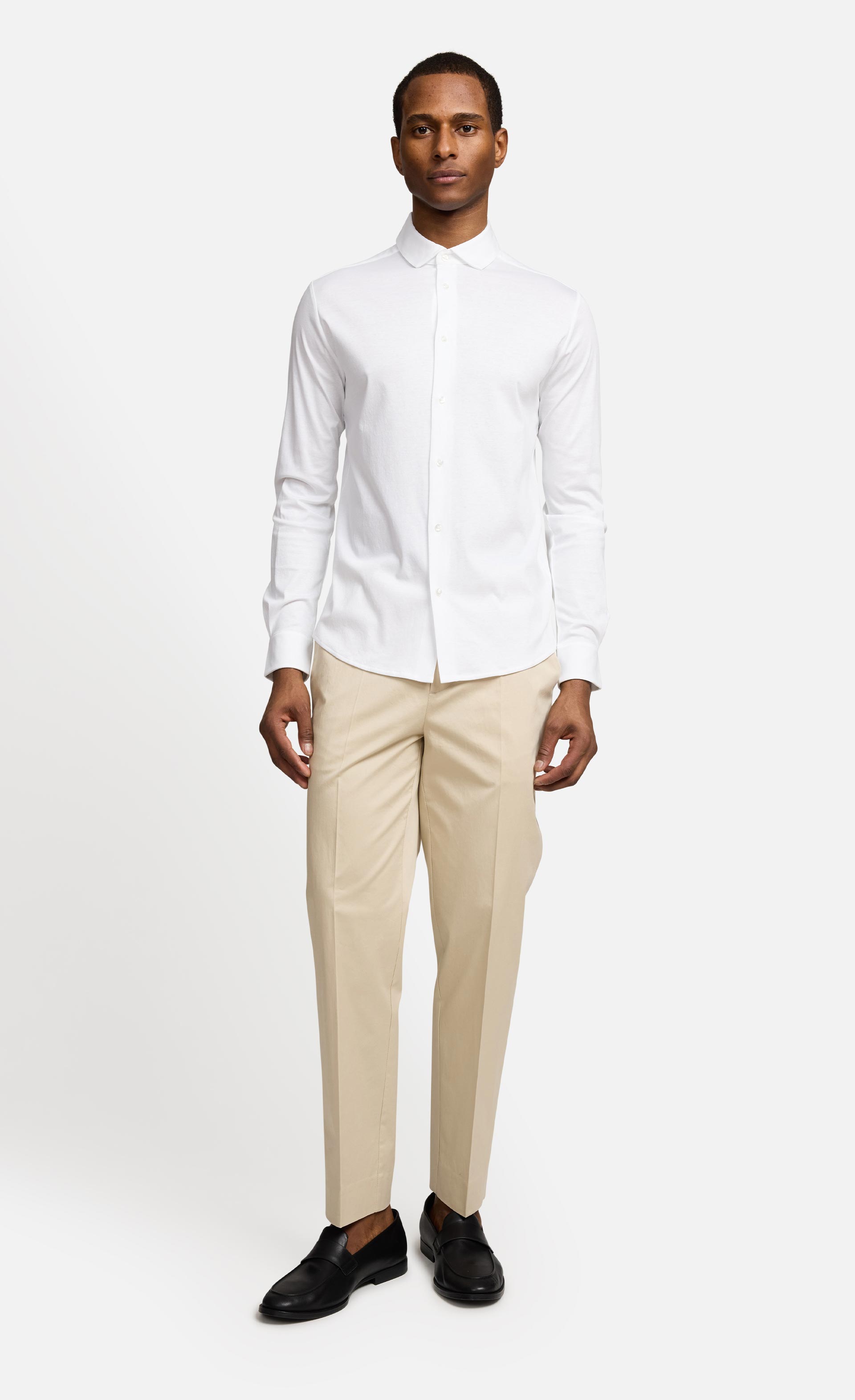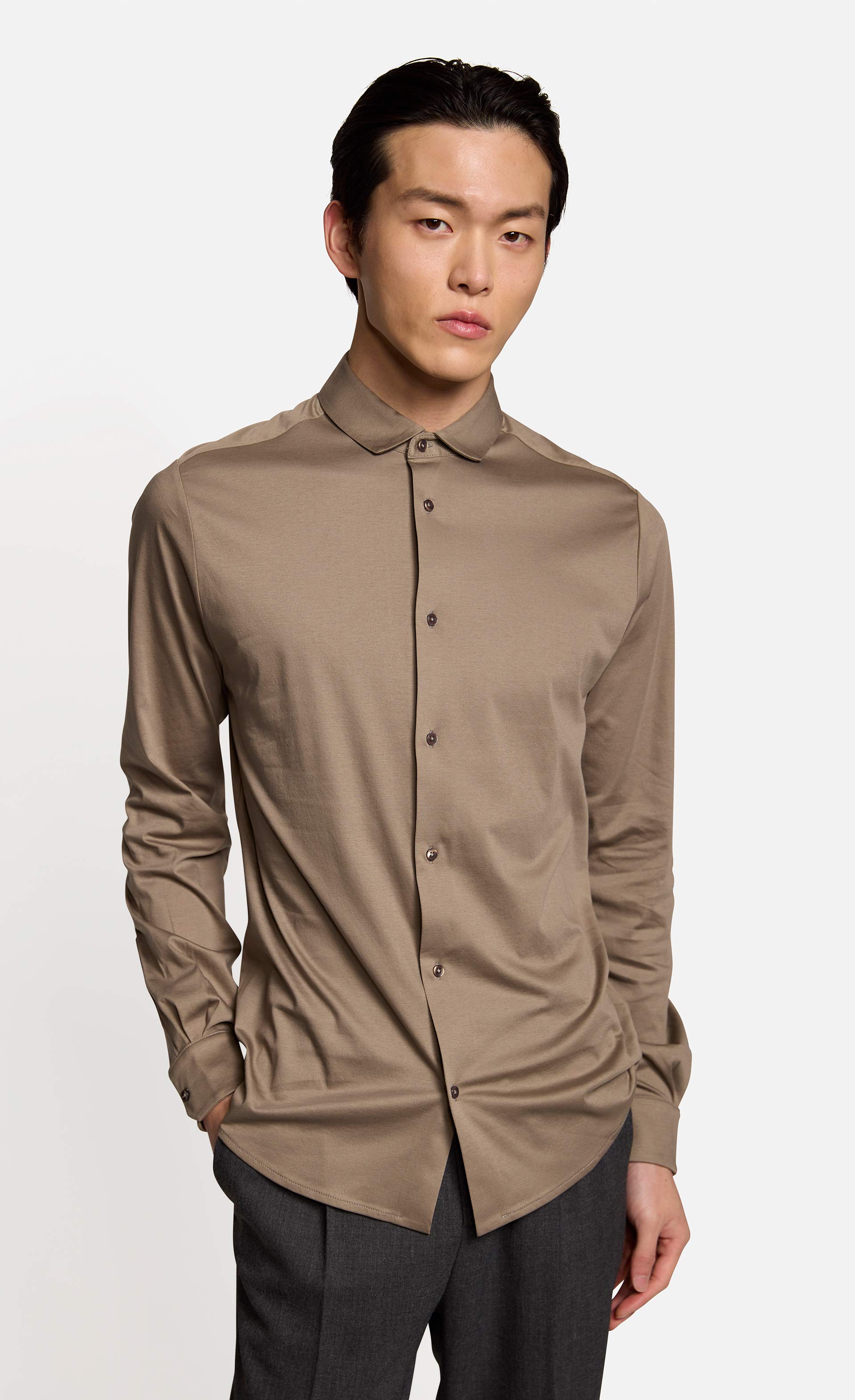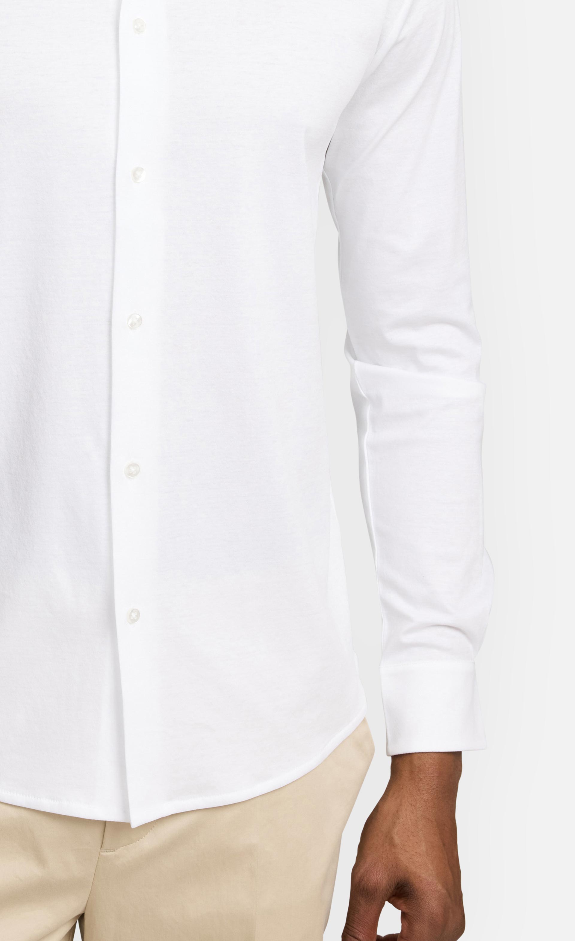 Dieses Hemd aus glatter, merzerisierter Baumwolle mit dezentem Glanz überzeugt durch den anschmiegsamen Jersey. Das Hemd kreiert durch den klassischen Haifischkragen, die sichtbare Knopfleiste und die knöpfbaren Manschetten einen eleganten und dennoch legeren Look.