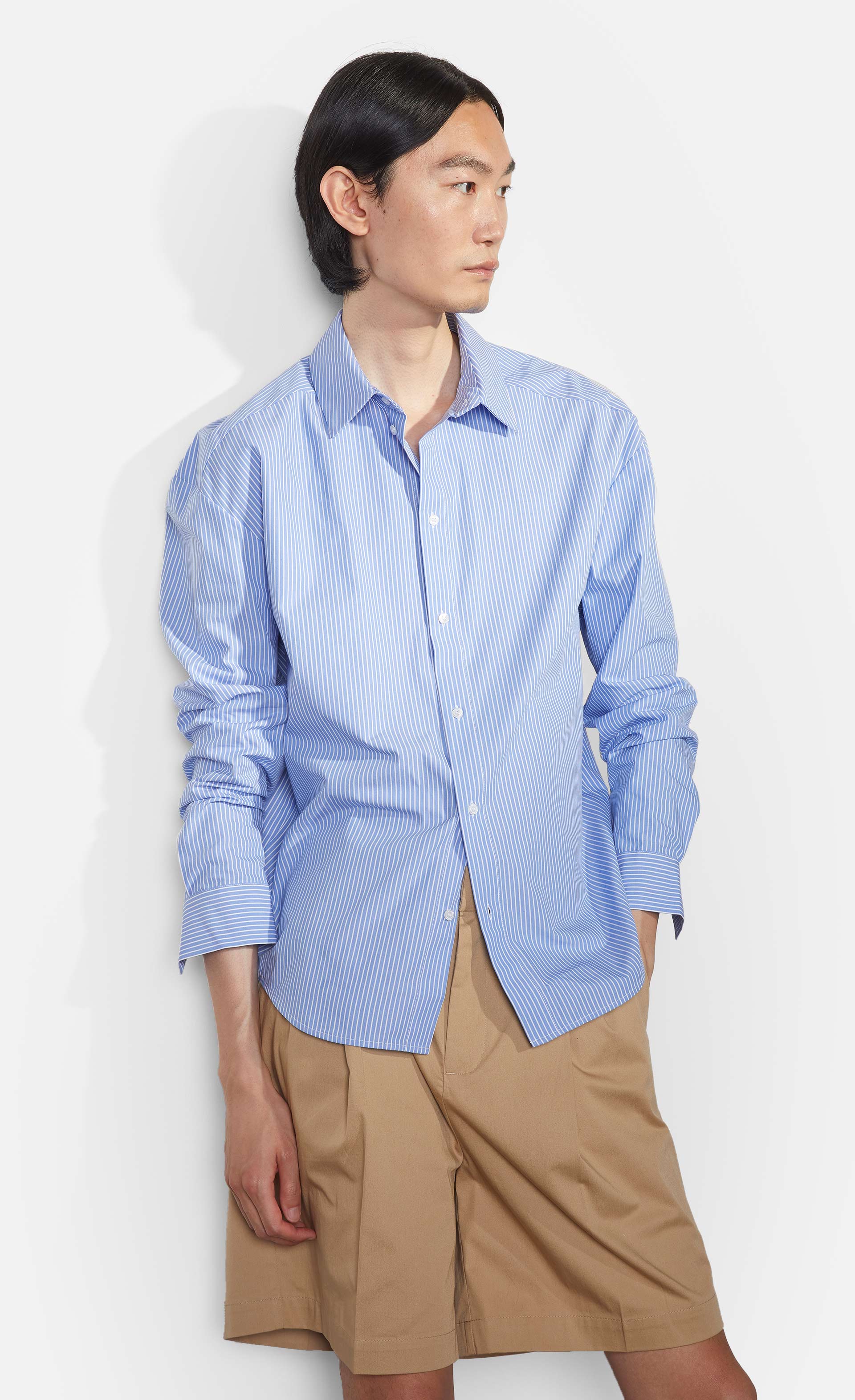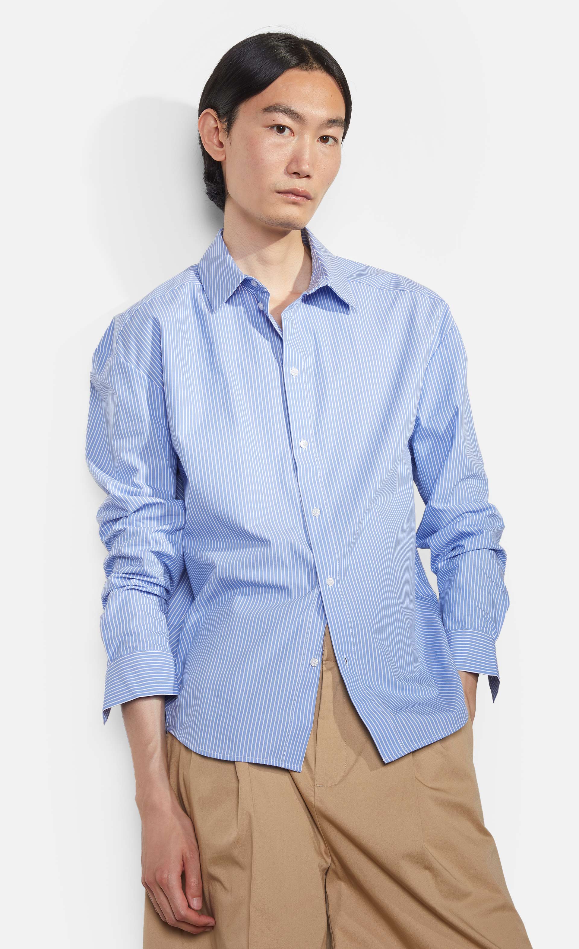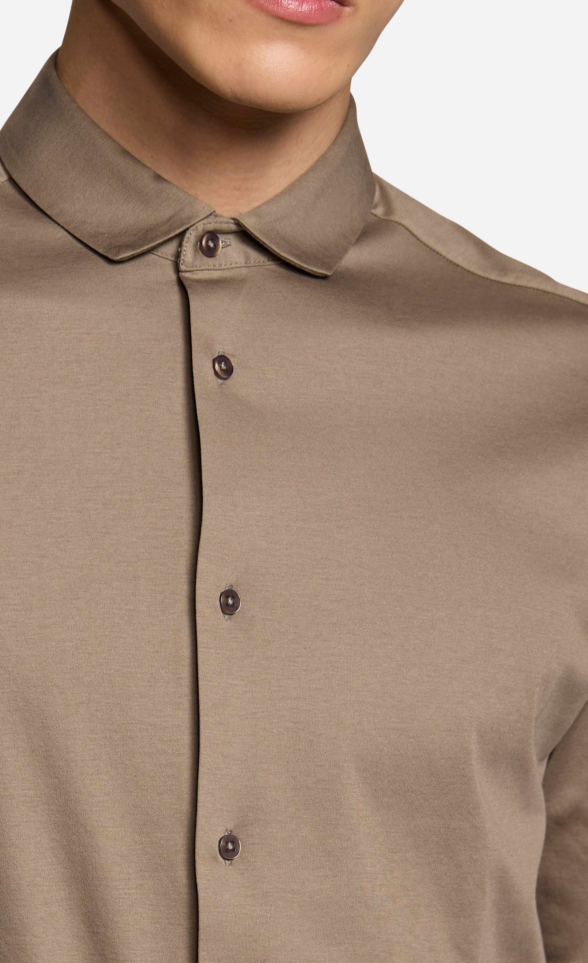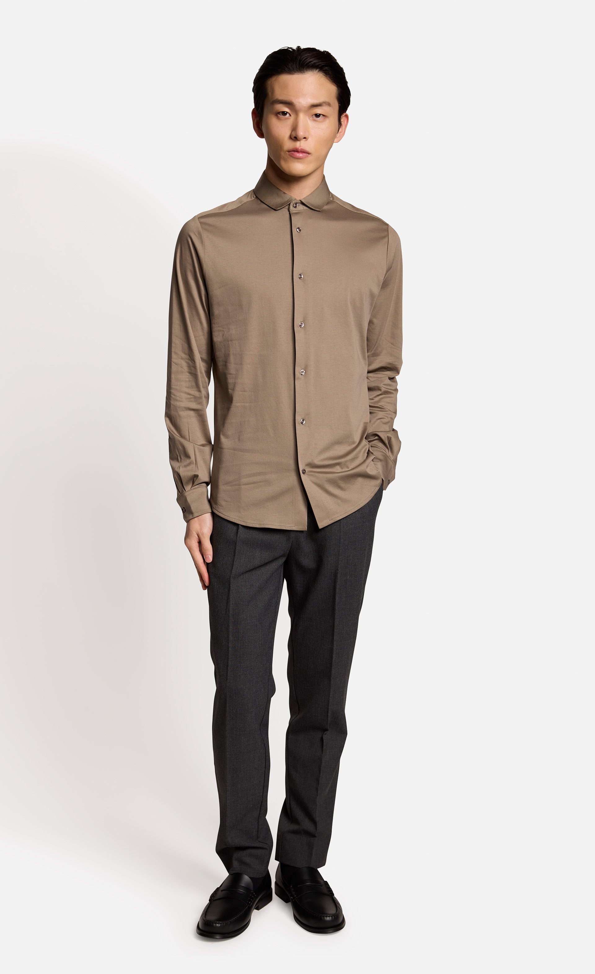 Dieses Hemd aus glatter, merzerisierter Baumwolle mit dezentem Glanz überzeugt durch den anschmiegsamen Jersey. Das Hemd kreiert durch den klassischen Haifischkragen, die sichtbare Knopfleiste und die knöpfbaren Manschetten einen eleganten und dennoch legeren Look.