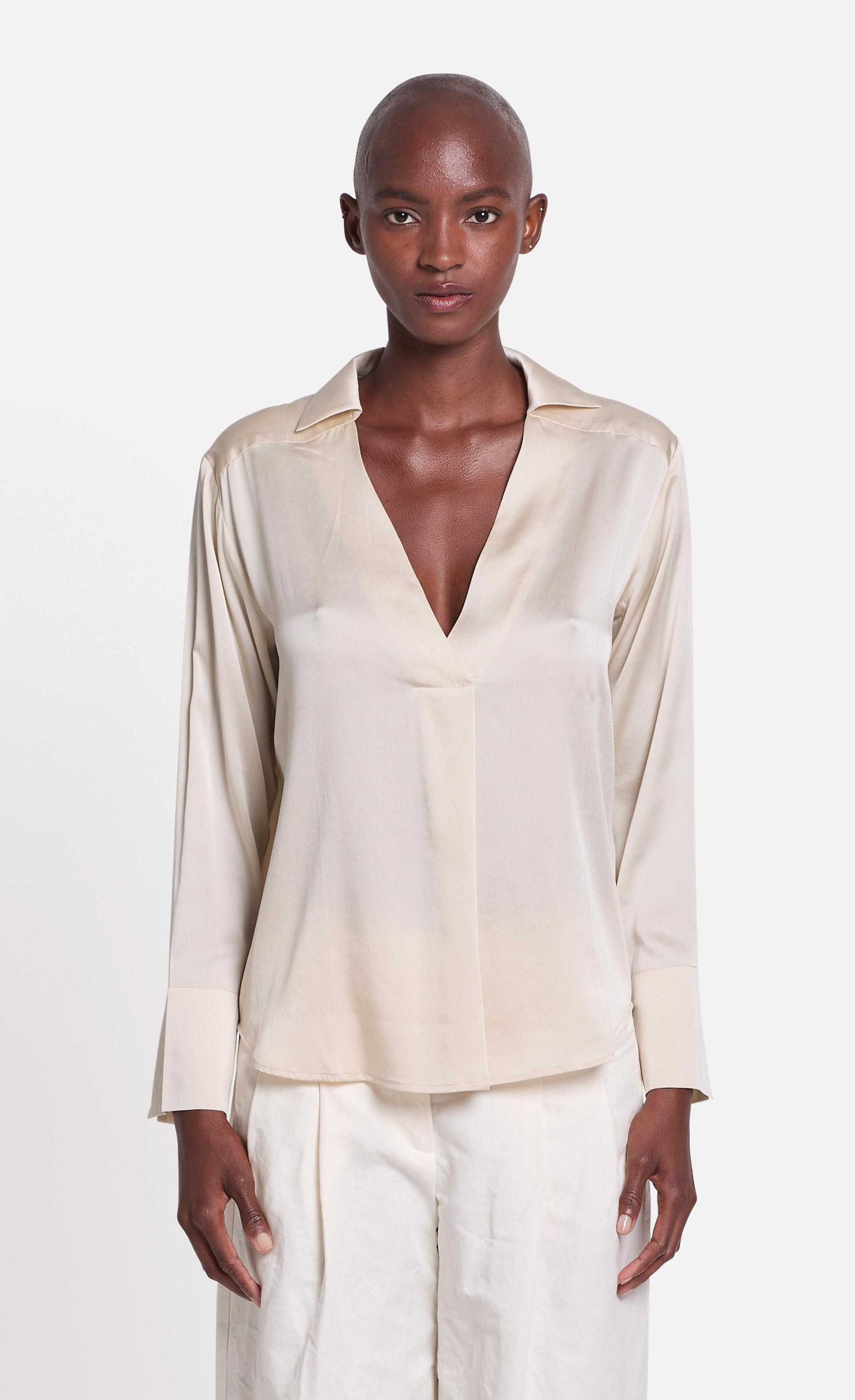 Dieses verkürzte Blusenshirt wurde aus matter Seide hergestellt.